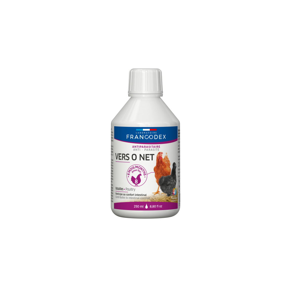 Le Vers O Net de Francodex est un complément alimentaire liquide enrichi en substances aromatiques naturelles telles que l’ail, le thym et la tanaisie, reconnues pour leurs bienfaits sur le confort digestif des volailles. Facile à administrer, il s’intègre parfaitement à une alimentation équilibrée pour maintenir la bonne santé intestinale de vos poules et autres volailles.