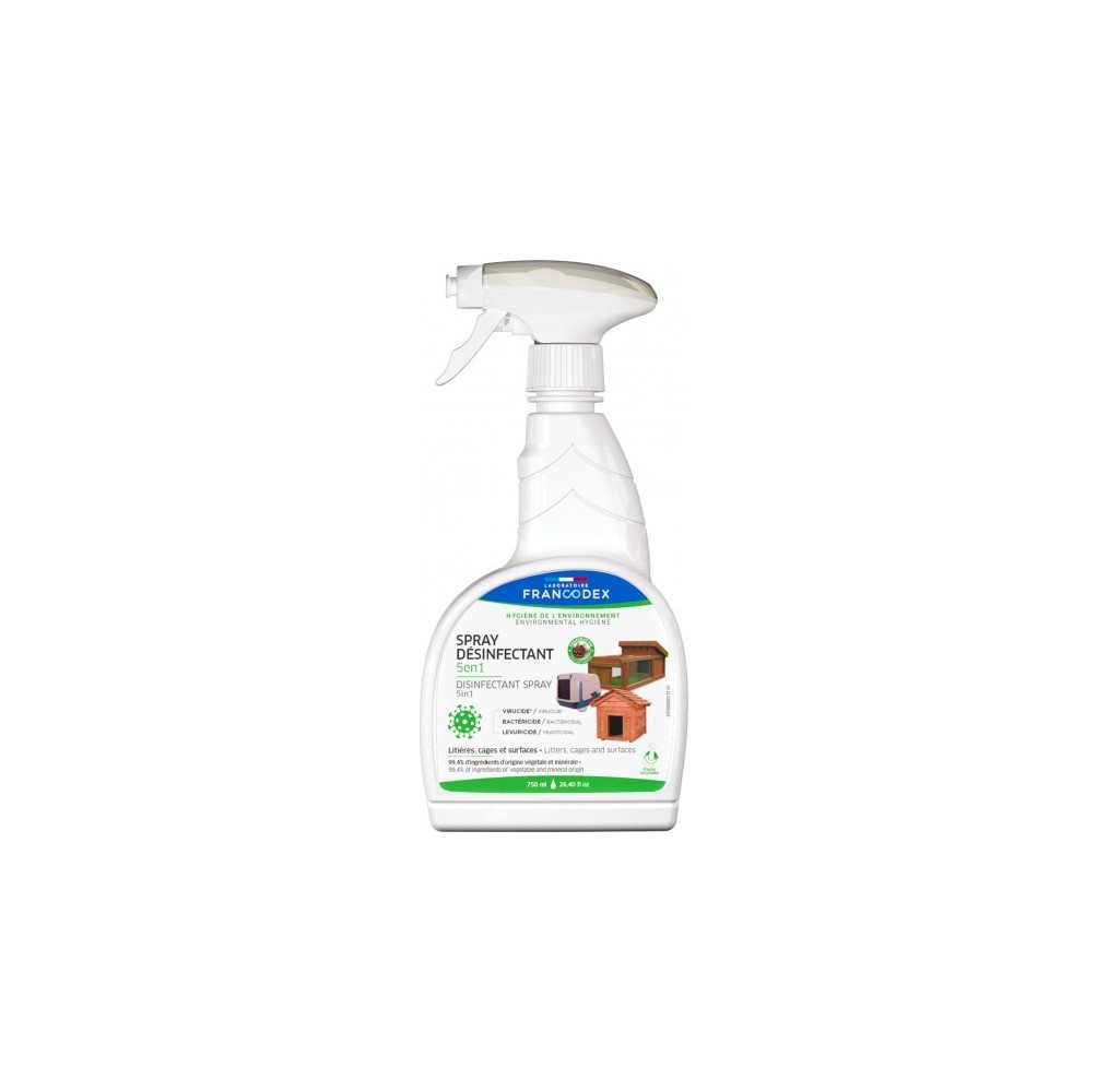 Assurez un environnement sain pour vos animaux avec le Spray Désinfectant 5 en 1 Francodex. Ce produit prêt à l'emploi nettoie, dégraisse, détartre, désinfecte et désodorise, tout en laissant une agréable senteur de pin. Il élimine efficacement les bactéries, virus, levures et champignons, garantissant une hygiène impeccable pour cages, volières, niches, mangeoires et bacs à litière.